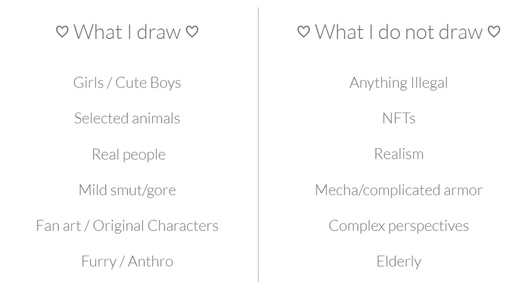 By purchasing anything from me, you automatically agree to these conditions.You are expected to follow and comply with these rules when you purchase commissions or adopts from me.Breaking any of these rules, will lead to you being blocked and blacklisted.I will not be responsible for any inconvenience that may occur if you choose not to read my T.O.S. So please take the time to read them carefully!♡♡♡- I have full rights to my artworks and can use them for my portfolio.- Refund requests will no longer be accepted once the sketch has been started.- I reserve the right to decline anything that I do not feel comfortable or confident in doing, without having to state my reason.-Commissions are for personal use only, unless stated otherwise. There will be additional fees for commercial-use so please talk to me about it.- If you are to resell/transfer ownership of a model, please let notify me beforehand and to whom it will be transferred to.- You cannot resell my works/designs for more than what you paid for them.- NFTs (Non-Fungible Tokens) are not permitted. If you find one of my works, it is stolen. Please inform me.- All goods are digital files and NOT printed or shipped, unless stated otherwise.- Only minimal revisions can be made after an artwork is finished.- I will email you the full resolution of the image upon completion. A smaller resolution of the finished drawing will be posted in my social media accounts.- If you are to repost the image anywhere, please credit me as the artist and link my Carrd or Twitter.- I am not responsible if you lose the file of the commission.- I will only start doing the commission once the payment is completed. For vtuber models or adopts above $150, I will accept payment plans.- Updates will be sent to you during the entire process of the commission (sketching, lining, and coloring)- Turnaround time is usually 3-18 days, depending on the commission type and my schedule.